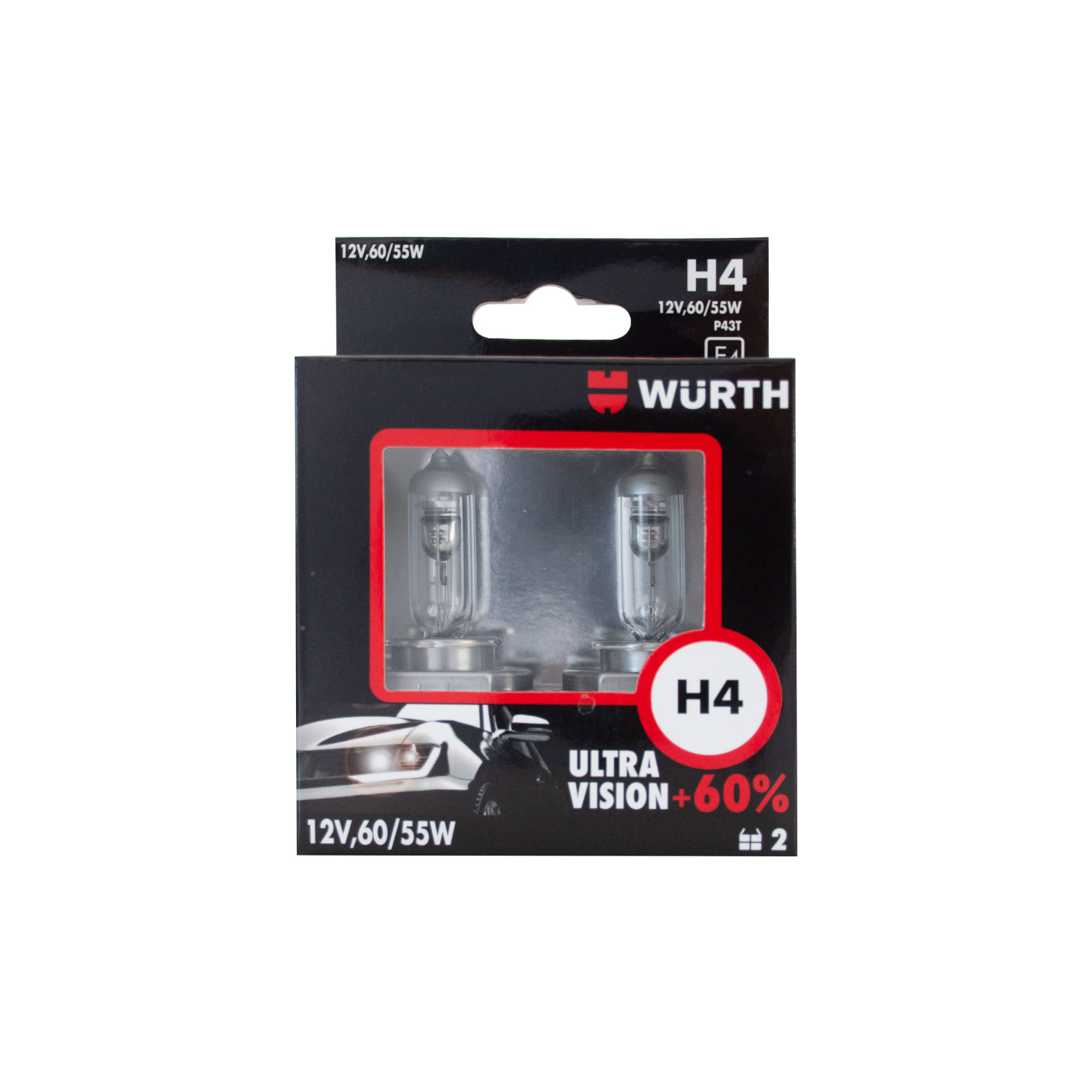 Ultra vision +60% е нов етап в развитието на линията халогенни крушки Wurth, предназначени за активни шофьори, които се грижат за собствената си безопасност, както и за тази на другите участници в движението. По-силната светлина на крушката е осигурена от новия дизайн на нажежаемата жичка, както и този на сребристия връх на крушката (при H4 и H7). Всичко това, окомплектовано с новия дизайн на опаковката, правят Ultra vision много привлекателен в програмата на Wurth за крушки за фарове за превозни средства с 12V инсталации.