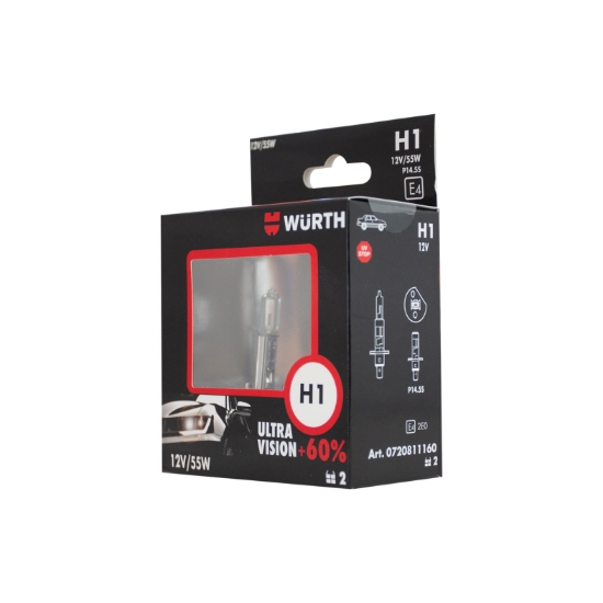 Ultra vision +60% е нов етап в развитието на линията халогенни крушки Wurth, предназначени за активни шофьори, които се грижат за собствената си безопасност, както и за тази на другите участници в движението. По-силната светлина на крушката е осигурена от новия дизайн на нажежаемата жичка, както и този на сребристия връх на крушката (при H4 и H7). Всичко това, окомплектовано с новия дизайн на опаковката, правят Ultra vision много привлекателен в програмата на Wurth за крушки за фарове за превозни средства с 12V инсталации.