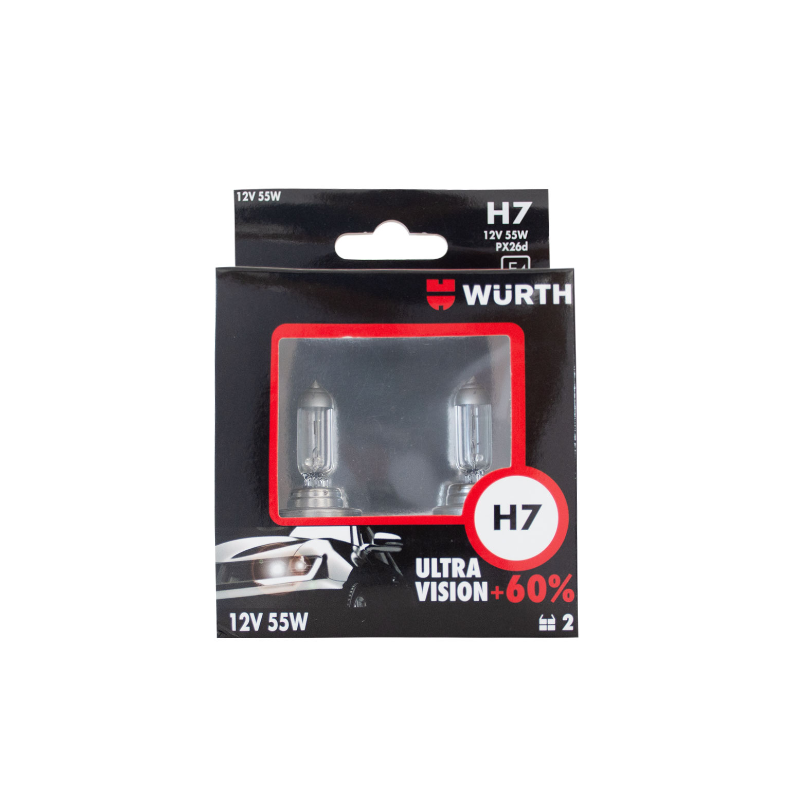 Ultra vision +60% е нов етап в развитието на линията халогенни крушки Wurth, предназначени за активни шофьори, които се грижат за собствената си безопасност, както и за тази на другите участници в движението. По-силната светлина на крушката е осигурена от новия дизайн на нажежаемата жичка, както и този на сребристия връх на крушката (при H4 и H7). Всичко това, окомплектовано с новия дизайн на опаковката, правят Ultra vision много привлекателен в програмата на Wurth за крушки за фарове за превозни средства с 12V инсталации.