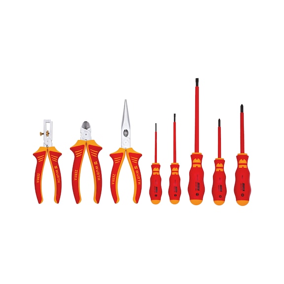 Комплект клещи и отвертки VDE осигуряващи изолация и защита от токово напрежение.