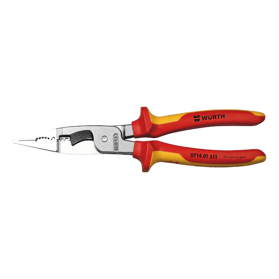 • Мултифункционални клещи за електрически инсталации; за захващане на плосъки и кръгъли материали, огъване, пробиване на отвори в конзоли и кутии, рязане на кабел, сваляне на изолация и кримпване на гилзи• Гладки повърхности на върха за захващане на проводници без увреждане; назъбени повърхности на захващане и отвор за захващане на плосъки и кръгъли материали• Остри външни ръбове на челюстта за обработка на скрити кутии, конзоли и сваляне на мустаците на проходни отвори• Сваляне изолация на кабели 0,7-1,5 мм² и 2,5 мм²• Кримпване на гилзи 0,5 – 2,5мм²• Ножица за кабели (индуктивна закалена) за Cu -и Al кабели до 5 х 2,5 мм2 или Ø 15 мм• Модел с вградена в шарнира отваряща се пружина и активиращ палец, който държи резците затворени, докато останалите функции остават на разположение. С този интелигентен механизъм за задържане може да се „хваща“, без да се отварят напълно клещите. Резецът остава затворен и защитен.• Компактна форма за трудно достъпни места• Шарнир на винт за прецизен и стабилен ход на инструмента• Изковани от специална инструментална стомана със специално качество, многократно закалено в масло
