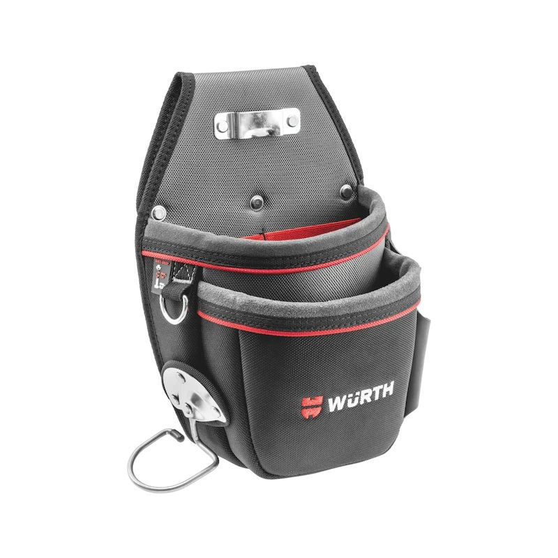 Кобур за инструменти с поставка за чук изработен от висококачествен полиестер и велурен кант. С две големи отделения за съхранение на инструменти и държач за чук. Два външни кожени джоба за отвертки, ножове и клещи. Свободно въртящ се държач за чук, изработен от неръждаема стомана. Държач за рулетка от неръждаема стомана.