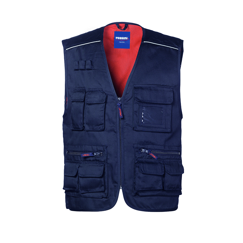 Работен летен елек с предно закопчаване с цип и светлоотразителни ленти. Два малки разтегателни джоба с велкро закопчаване, разширяващ се джоб, PVC държач за значки, държач за писалка с три отделения. Два малки разширяеми джоба, два разширяващи се джоба със закопчаване с цип.
