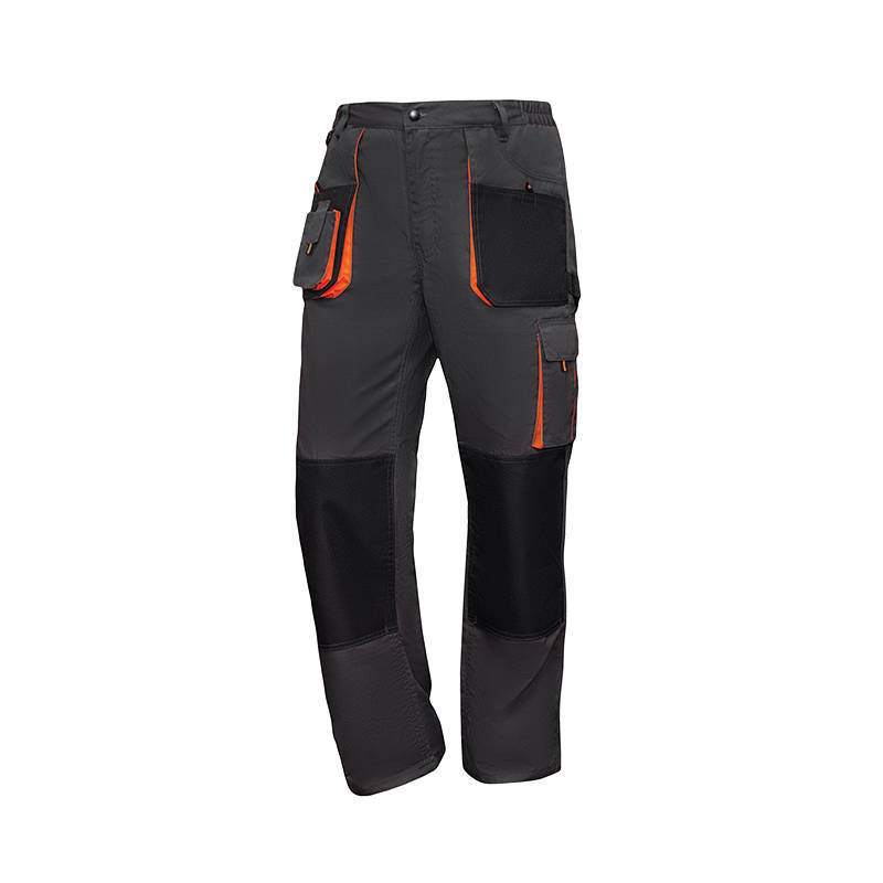 Благодарение на качествения материал, модерен дизайн и елегантна цветова комбинация с много практични джобове, работните панталони STRETCH ще ви осигурят комфорт и защита при работа. Изработен е от висококачествена тъкан с полиестерно подсилване на места, изложени на по-голямо износване - колена и лакти, в сиво с оранжеви детайли.