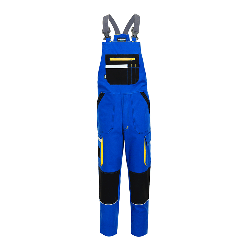 Всесезонен полугащеризон с голяма еластичност за работа, голяма лента за защита на бъбреците, еластични презрамки, катарами с автоматично затваряне, удобно странично отваряне с пластмасов цип и велкро затваряне. Двоен джоб на гърдите, единият с пластмасов цип, а другият с отразяваща лента и държач за писалка, два големи предни джоба с контрастно външно усилване, многофункционален разширяващ се страничен джоб със свалящ се държач за значки и светлоотразителна лента, един разширяващ се страничен джоб, затворен с flap и велкро, заден джоб, затворен велкро. Подсилени колене и светлоотразителни елементи.