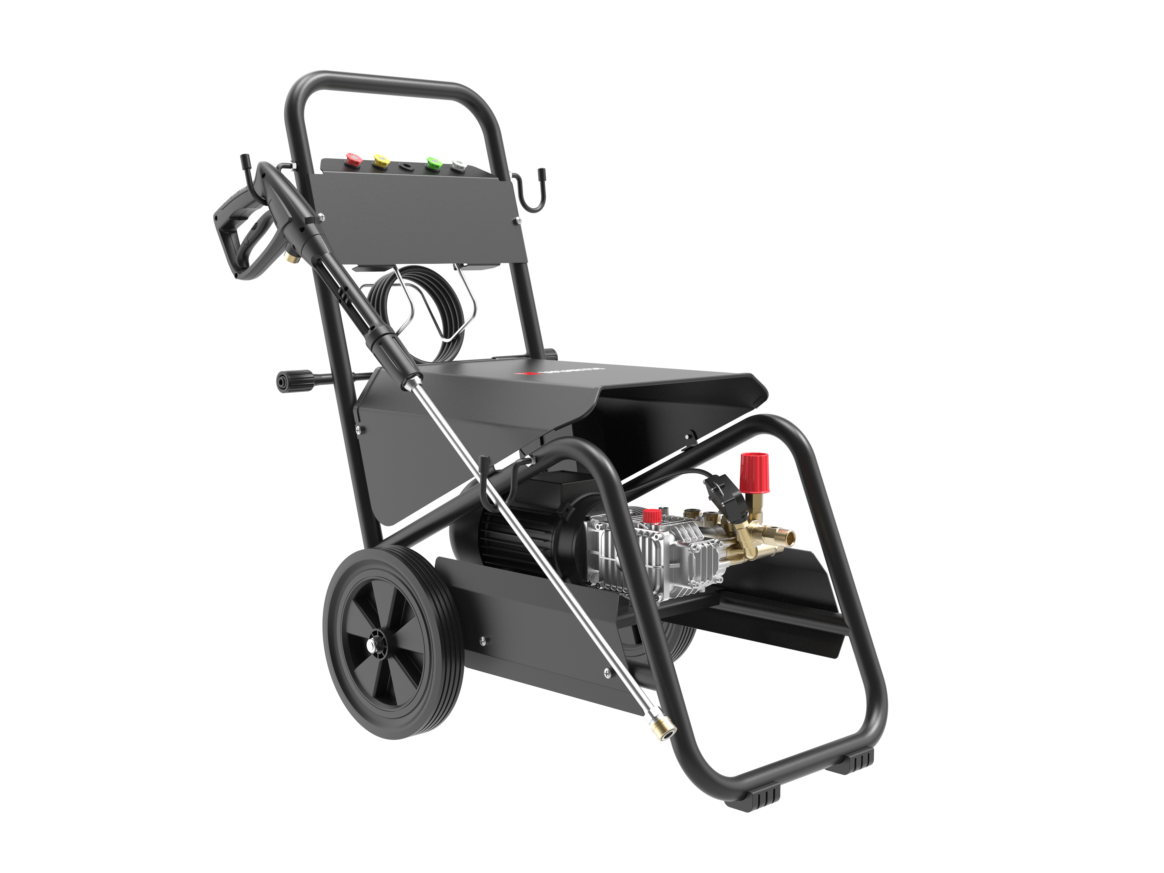 Мощна водоструйка за почистване със студена вода под високо налягане с макара за маркуч, за тежки задачи по почистване средно 8 часа на ден. Здрав дизайн на метална рамка с големи колела за добра мобилност.