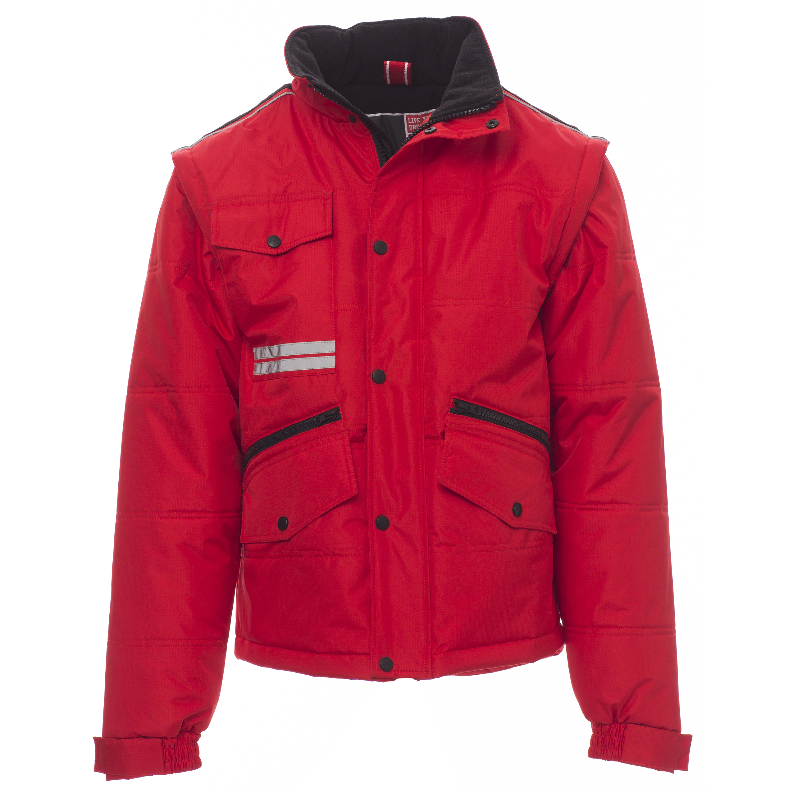 8 мм пластмасов цип с метално издърпване, с велкро, цип и пластмасови копчета, сгъваема качулка в яката, два външни джоба LOCK SYSTEM, два джоба с цип, джобове за по-лесен достъп, джоб за смартфон място за значка, отразяващи ивици върху джоба и гърба. Подплатена, контрастна подплата на на гърба и яката, вътрешен джоб, вътрешен цип за по-лесен печат и бродерия.